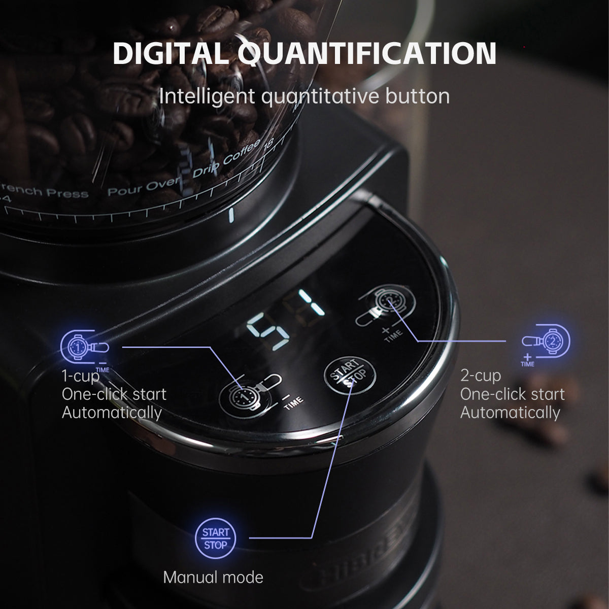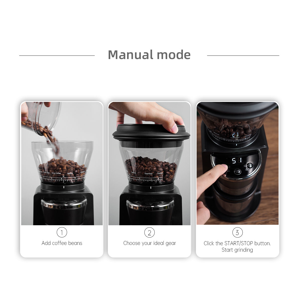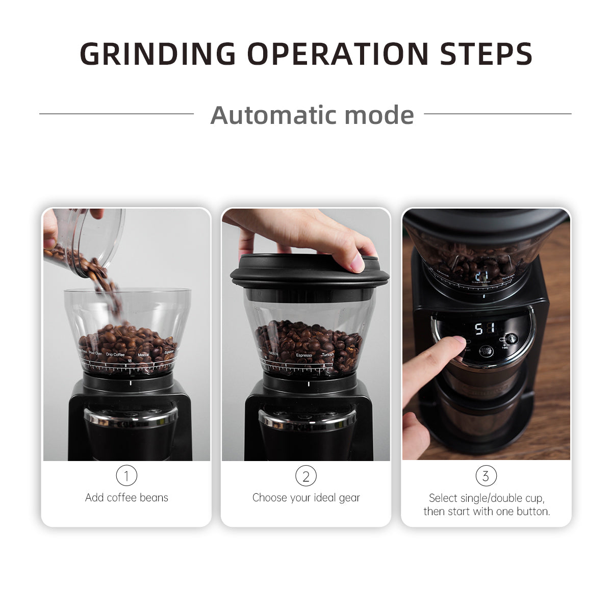 3-step grinding: Add beans, select gear, and press start. HiBREW G3’s auto/manual modes make barista-quality coffee effortless.