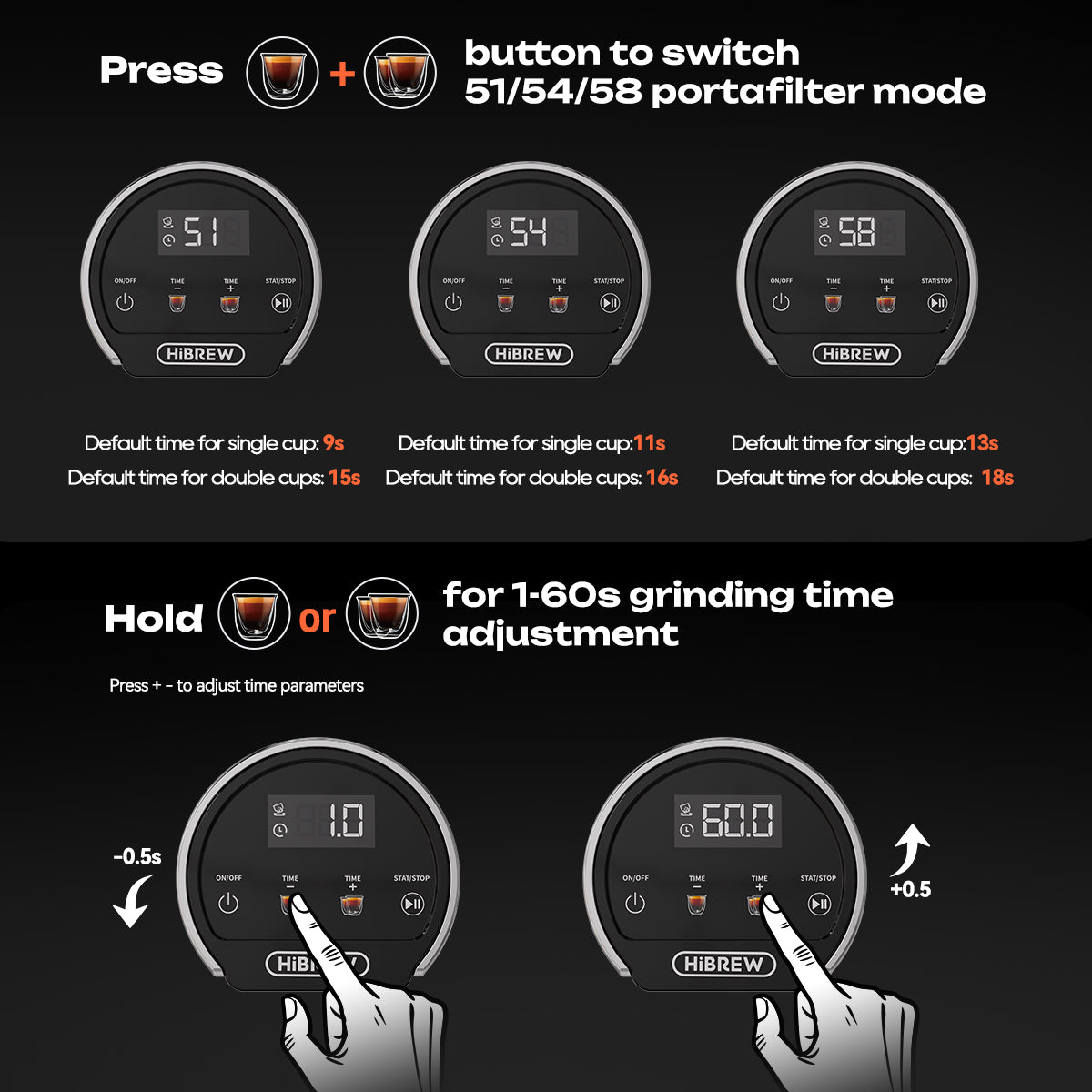 Switch between 51mm, 54mm, and 58mm portafilter modes with a single tap. Pre-set or customize grinding times for single and double shots, with adjustable duration from 1 to 60 seconds.