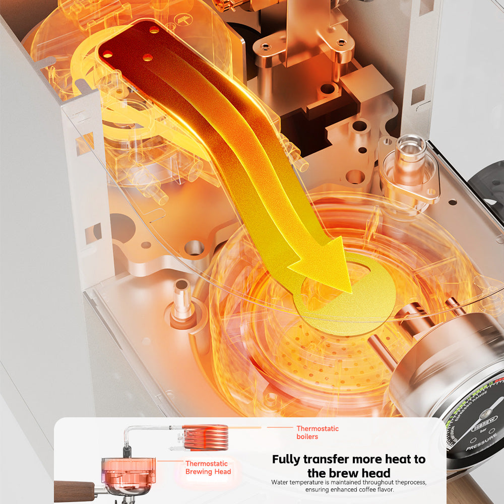 Eine Aluminiumbrücke verbindet den Hauptheizer mit dem Brühkopf und sorgt dafür, dass der Brühkopf während des Extraktionsprozesses so warm wie möglich bleibt. Dieser innovative Ansatz sorgt dafür, dass die Temperatur am Brühkopf während des gesamten Extraktionsprozesses konstant bleibt, indem die Wärme des Hauptheizers genutzt wird.