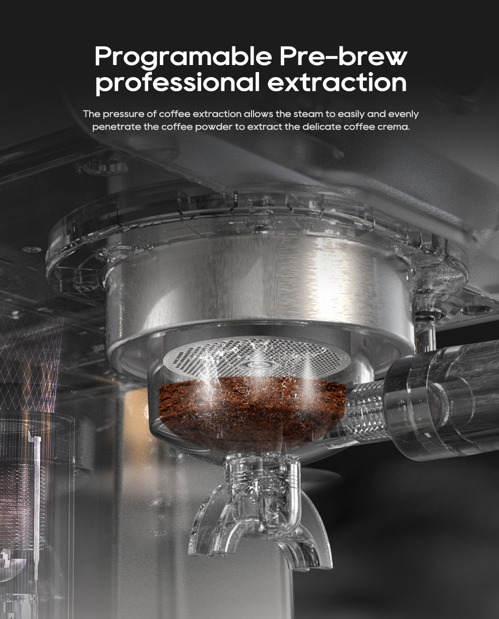 Dieser Prozess trägt dazu bei, die Kanalbildung zu reduzieren und die Extraktion zu verbessern, wodurch ein ausgewogenerer Schuss mit reichhaltigen, ausgeprägten Aromen gewährleistet wird – eine Funktion, die normalerweise teureren Maschinen vorbehalten ist.