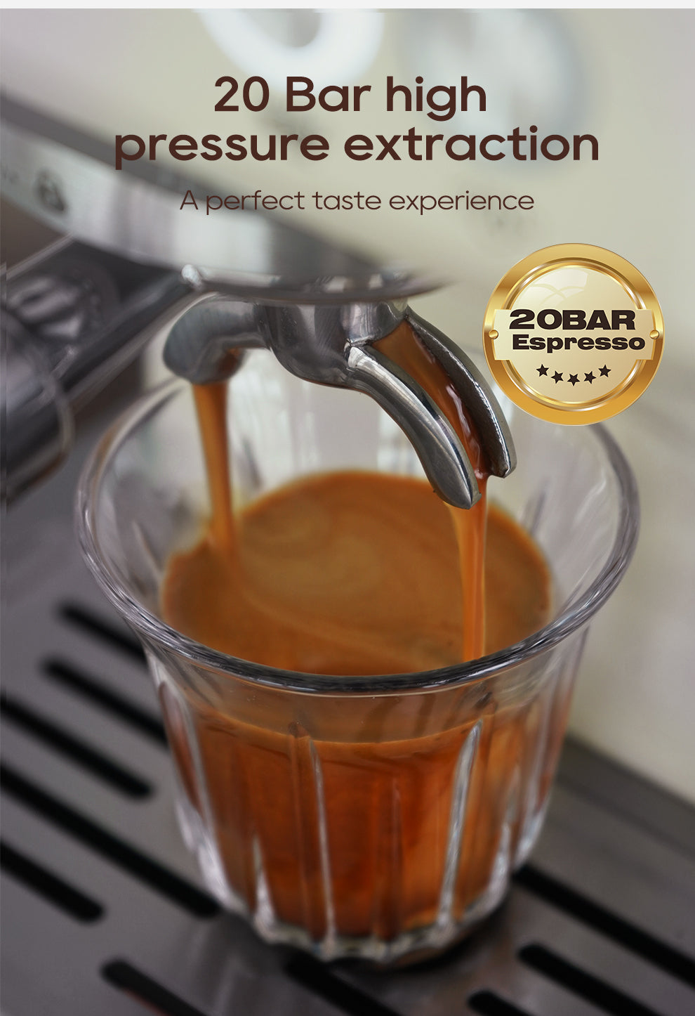 - Professionelle 20-bar-Pumpe: Sorgt für eine gleichmäßige Extraktion mit hohem Druck für volle Aromen und reichhaltige Crema