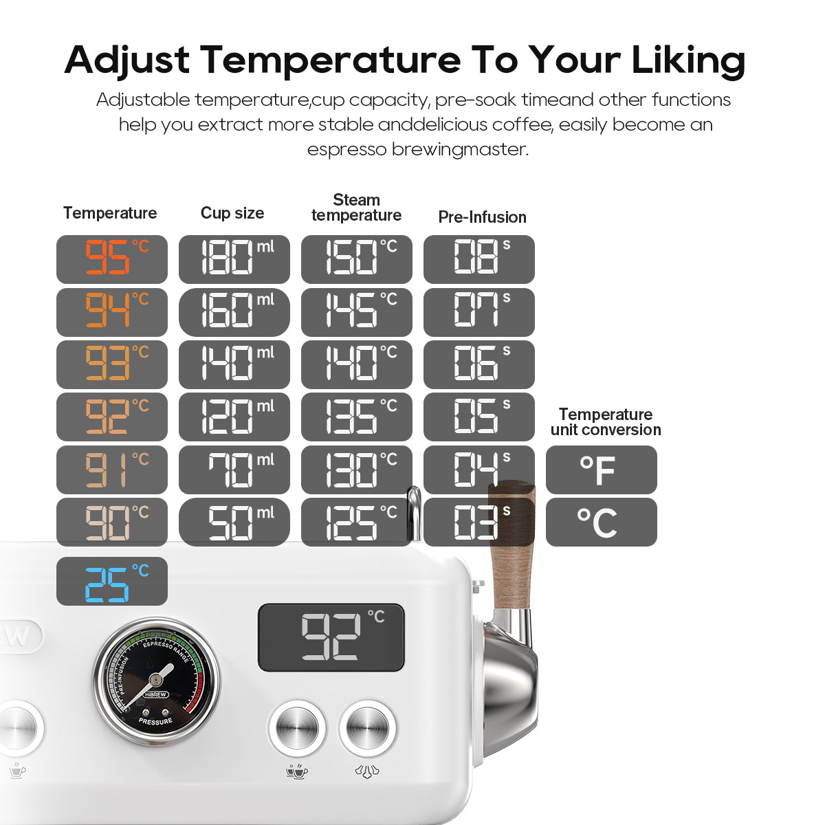 Take full control of your brewing and steaming processes with adjustable temperature settings.