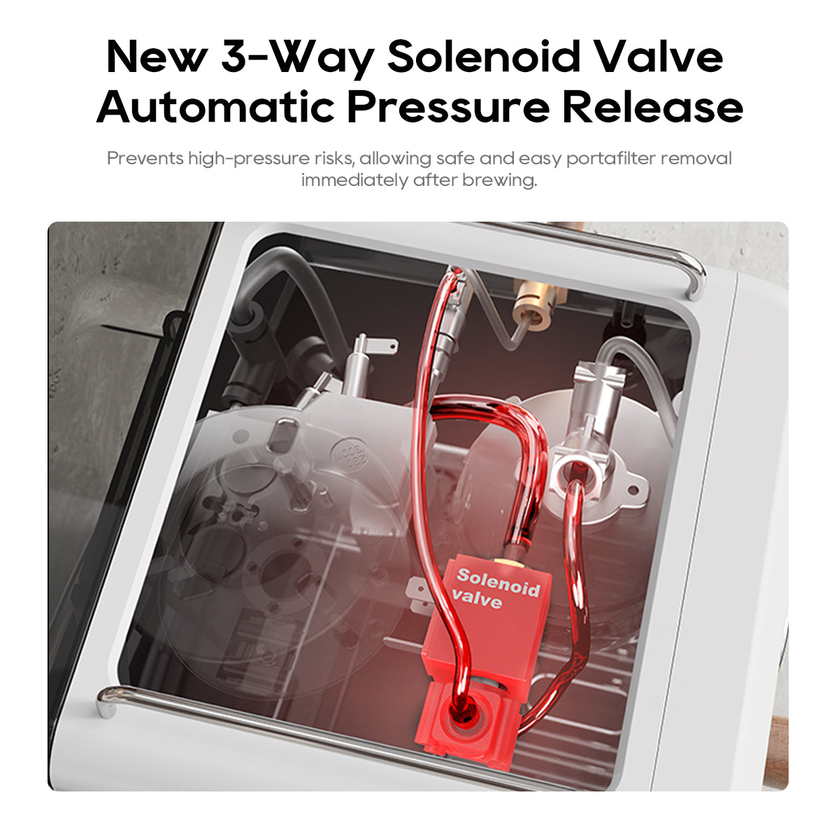 3-way solenoid valve for automatic pressure release, preventing high-pressure risks.