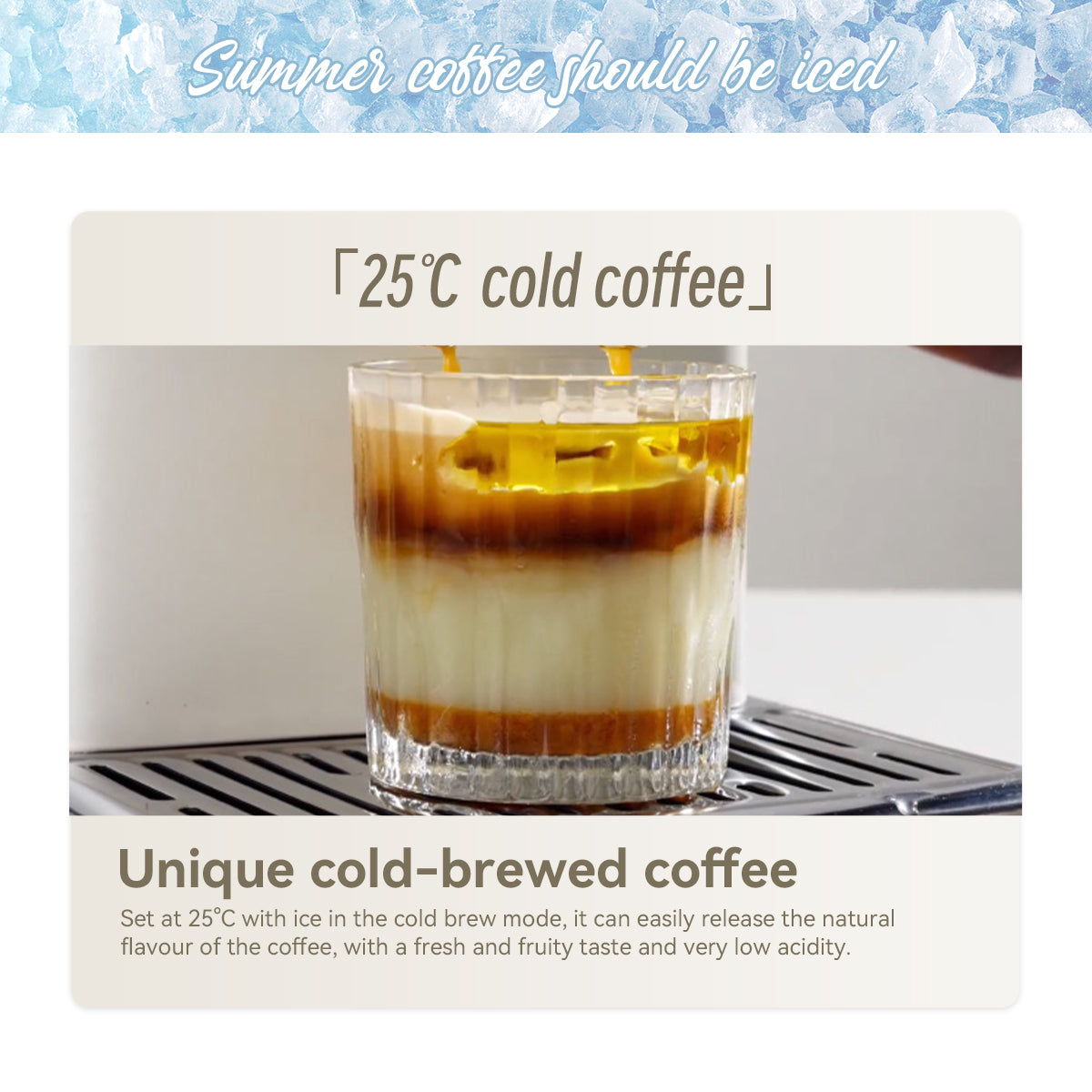 Cold brew mode (25°C) for refreshing iced coffee with low acidity.